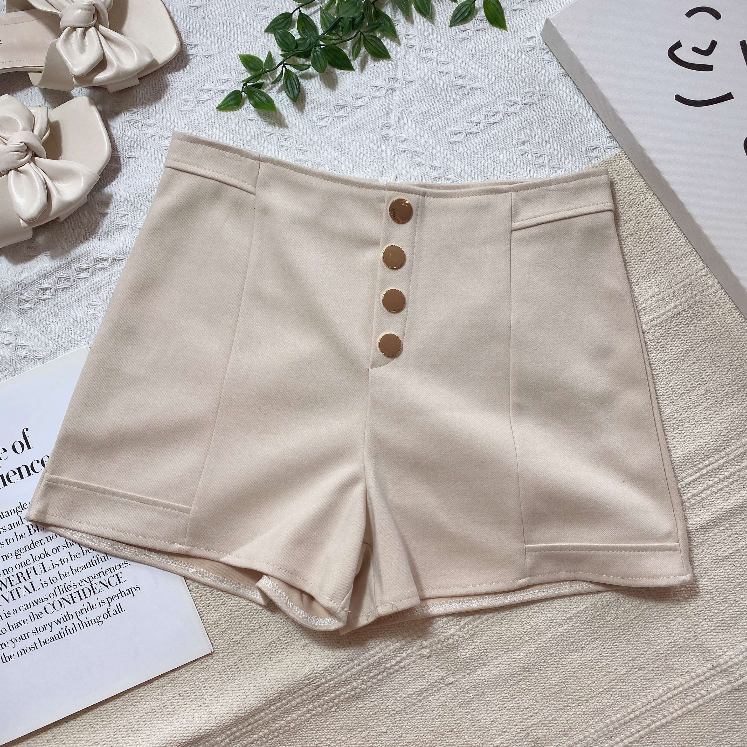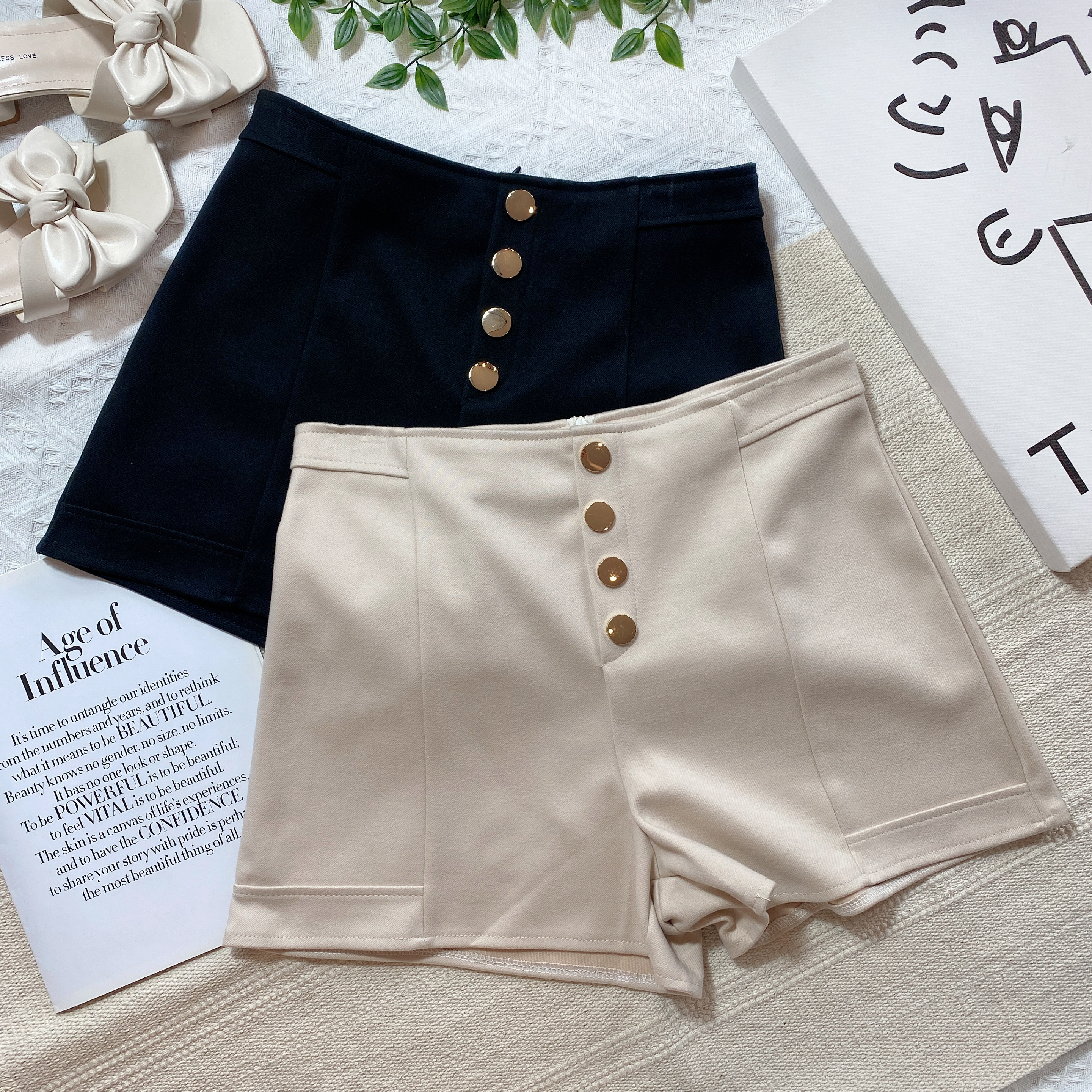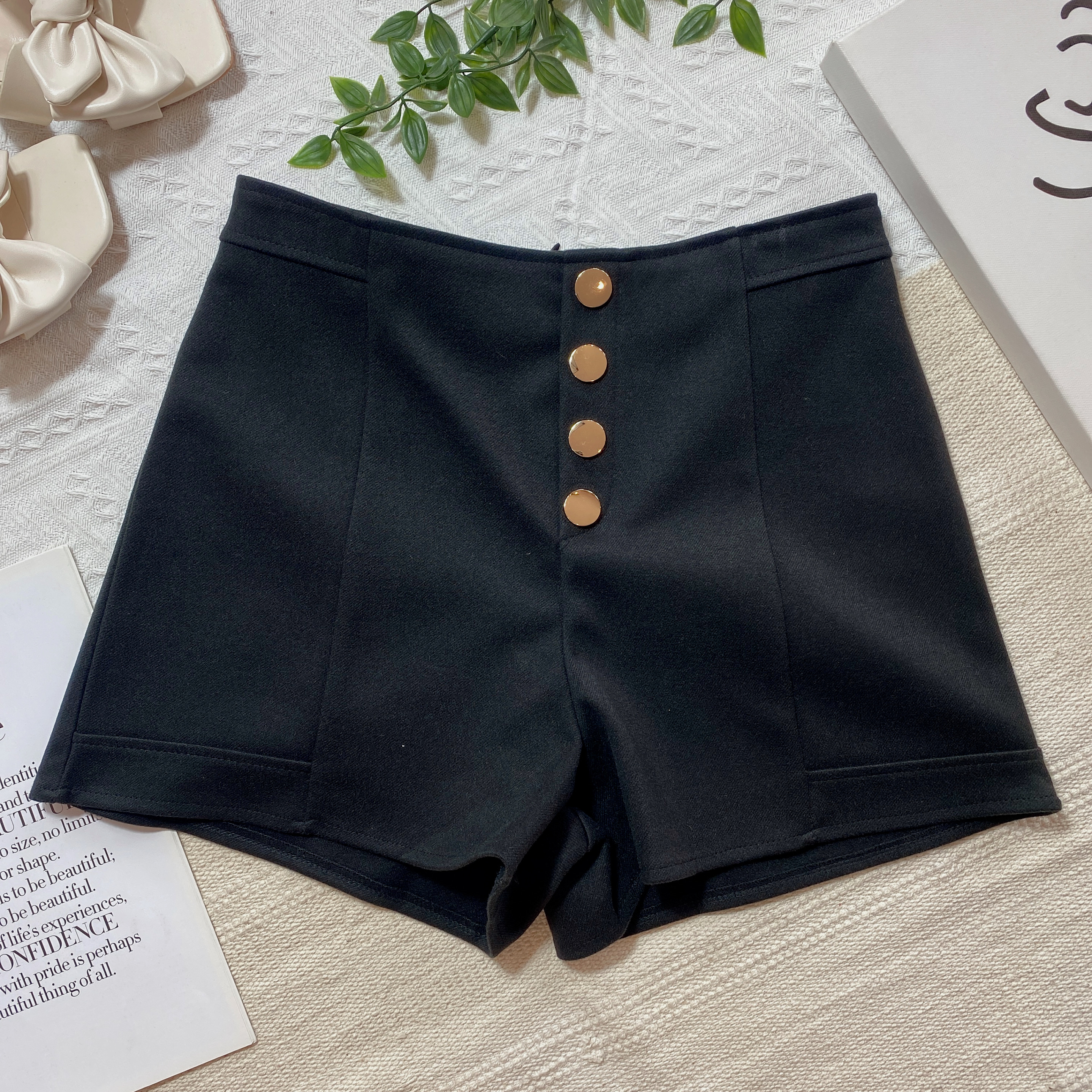 B02314 毛呢短裤假排纽设计XS-腰围60-64cm、臀围82-86cm,长度31cm黑色3、杏色3S-腰围66-68cm,臀围86-91cm,长度31cm黑色3、杏色3M-腰围68-70cm,臀围92-97cm,长度33cm黑色3、杏色2L-腰围72-76cm,臀围94-100cm,长度33cm黑色3、杏色3RM55