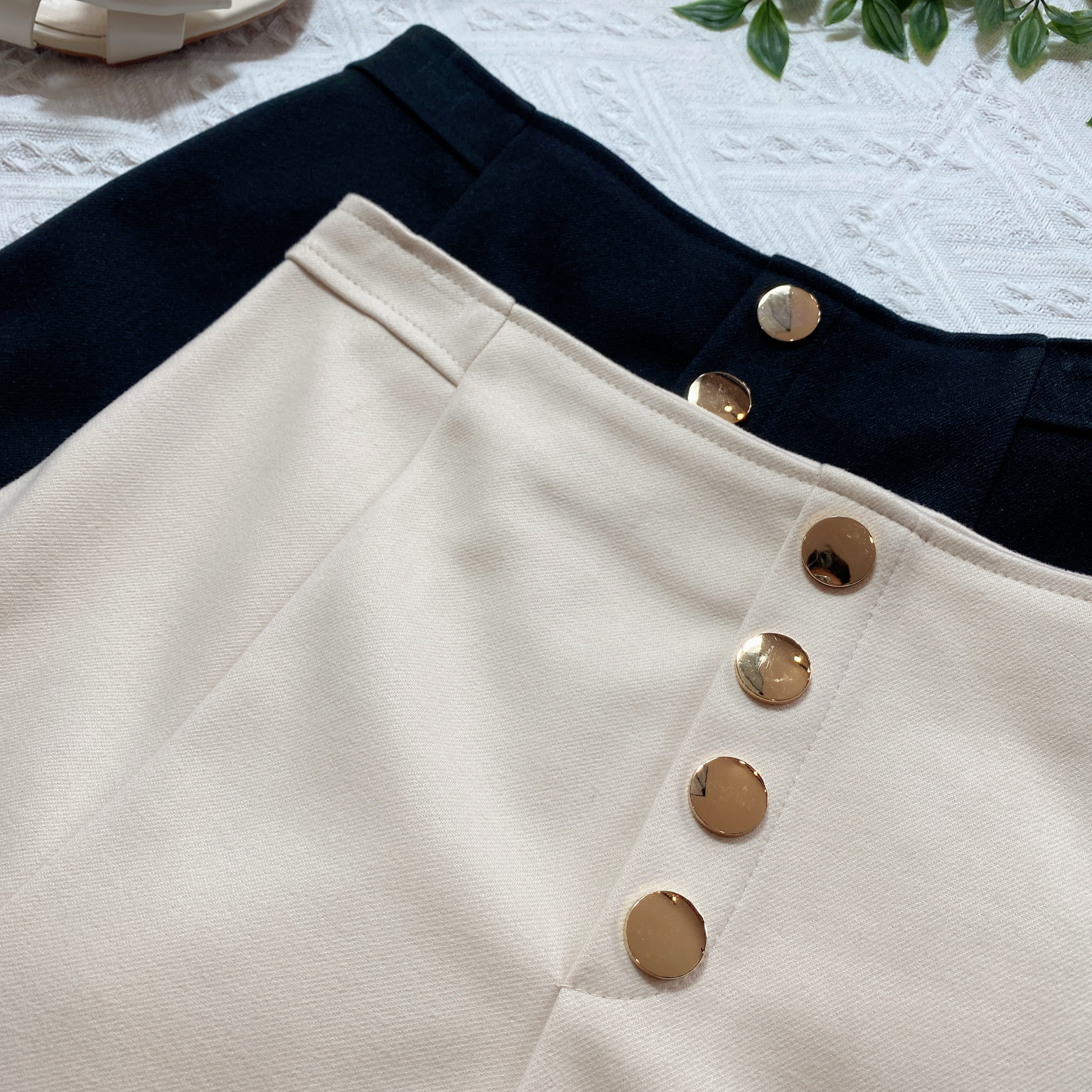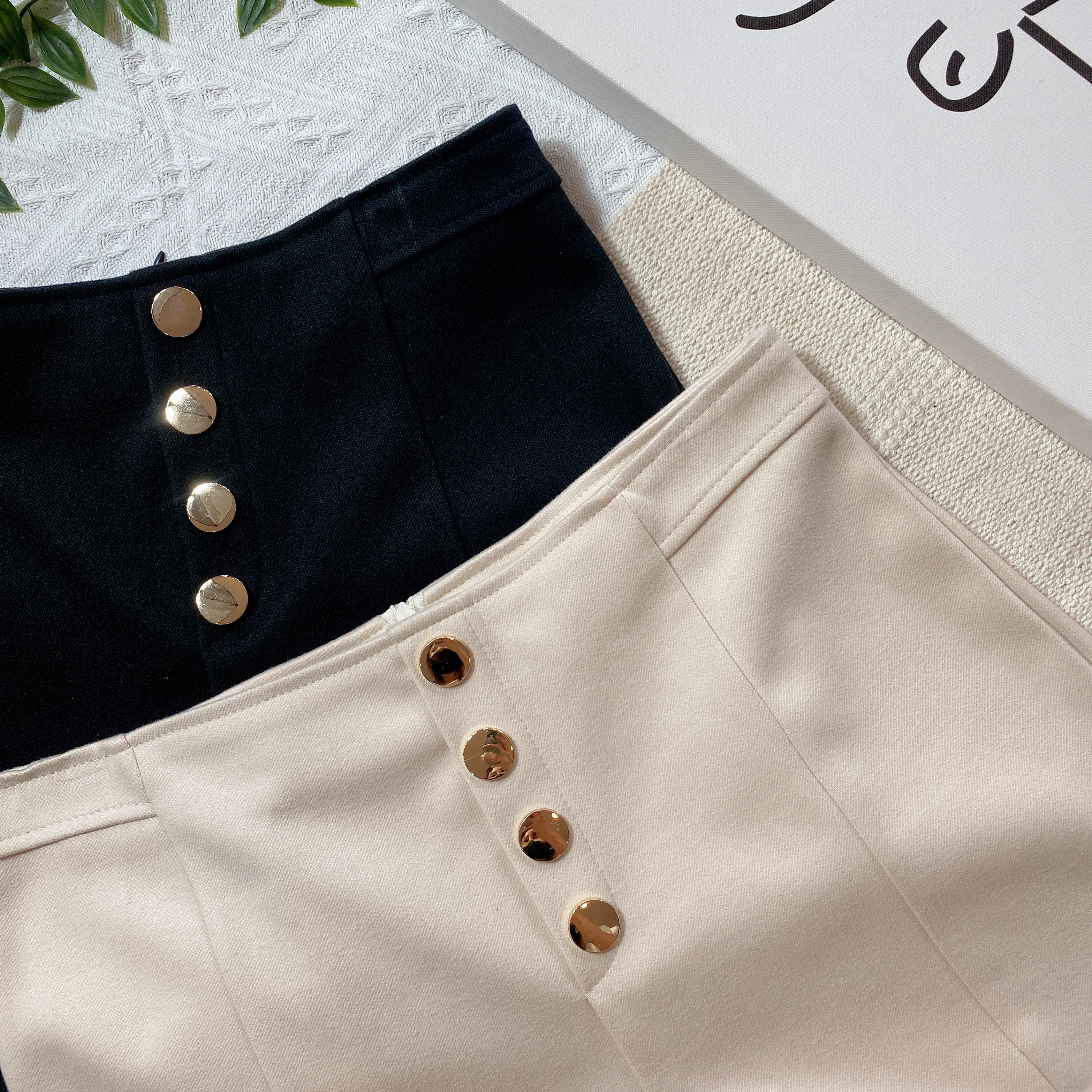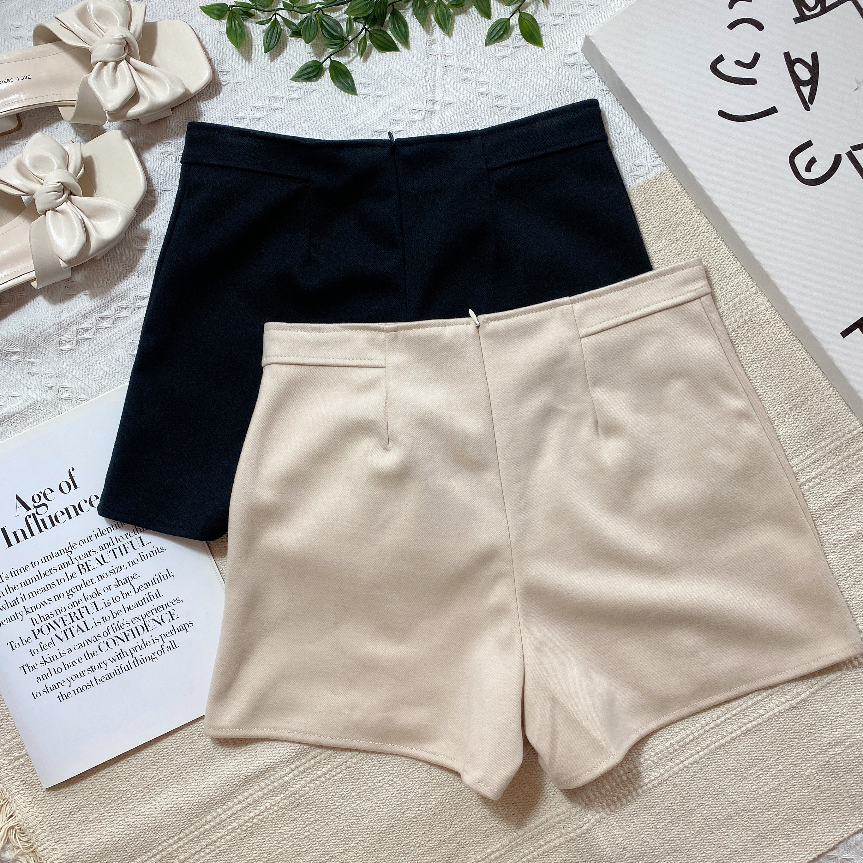 B02314 毛呢短裤假排纽设计XS-腰围60-64cm、臀围82-86cm,长度31cm黑色3、杏色3S-腰围66-68cm,臀围86-91cm,长度31cm黑色3、杏色3M-腰围68-70cm,臀围92-97cm,长度33cm黑色3、杏色2L-腰围72-76cm,臀围94-100cm,长度33cm黑色3、杏色3RM55