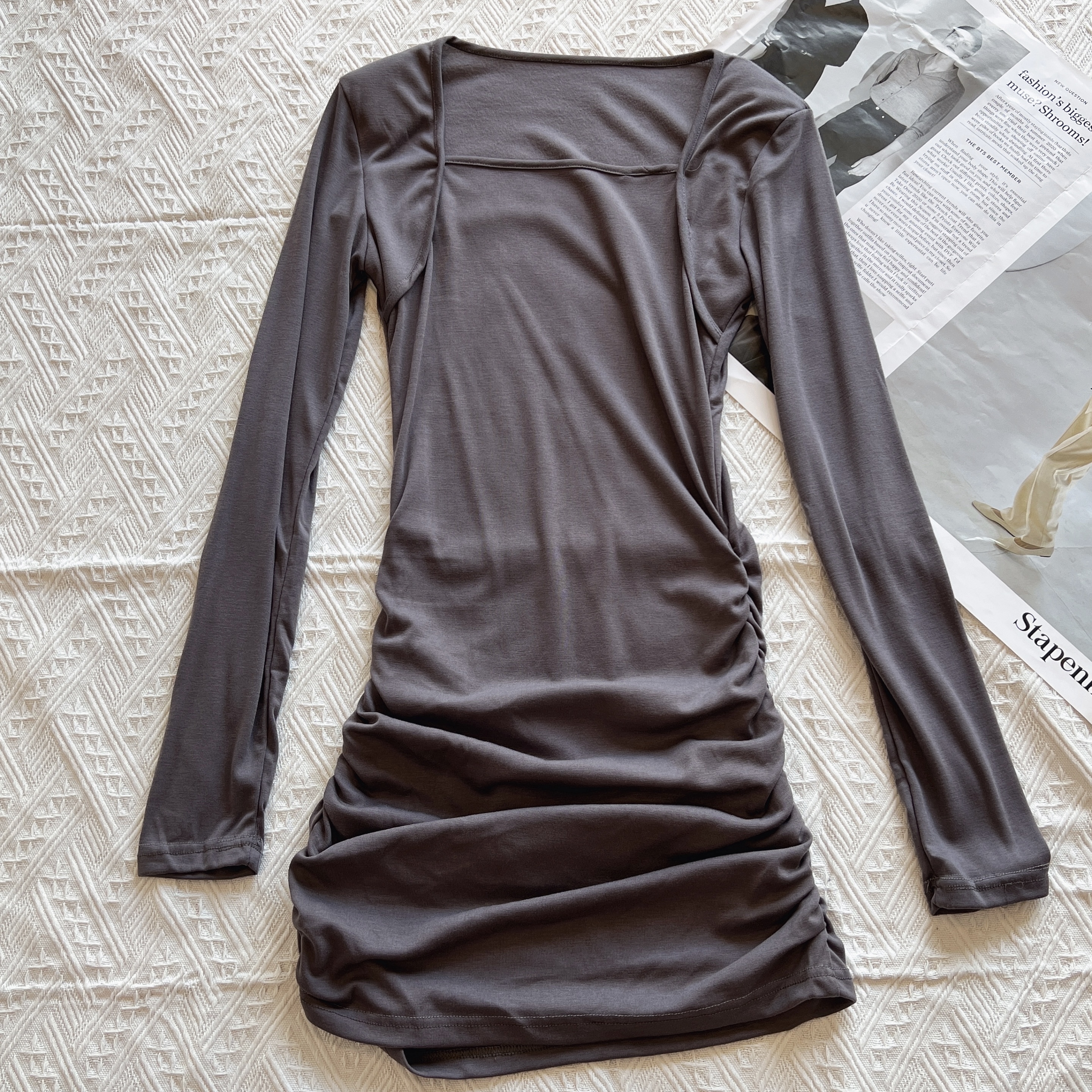 A13114 方领长袖修身连衣裙M-胸围66-90cm、腰围56-80cm、臀围68-90cm、长度74cmL-胸围72-100cm、腰围58-84cm、臀围58-100cm、长度76cm黑色、咖啡色、灰色